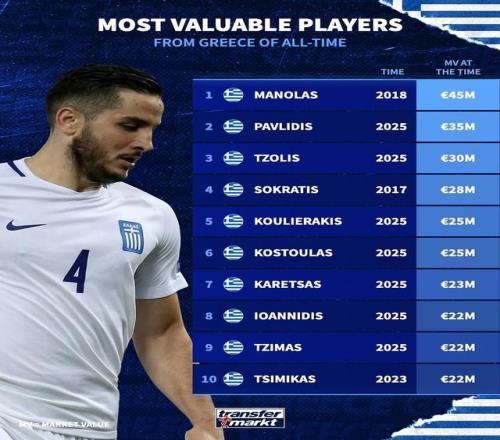 北京时间11月16日,德转列出了希腊历史身价排名前10的球员,2018年身价曾经达到4500万欧元的马诺拉斯高居第一,本菲卡前锋帕夫利季斯3500万欧元第二,利物浦的旧将齐米卡斯排在第十位4,布莱顿的两位新星18岁的科斯图拉斯和19岁的齐马斯上榜。