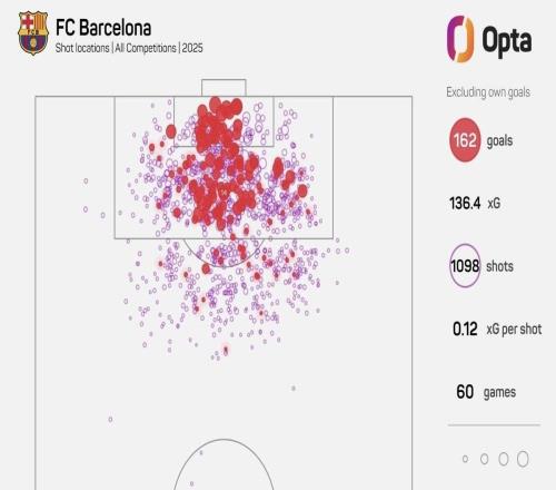 巴萨2025年60战46胜,费兰、莱万27球并列队内第一射手 -